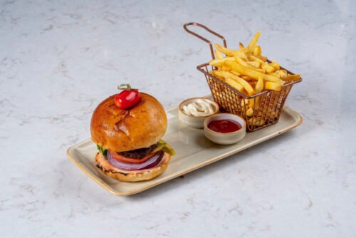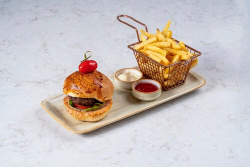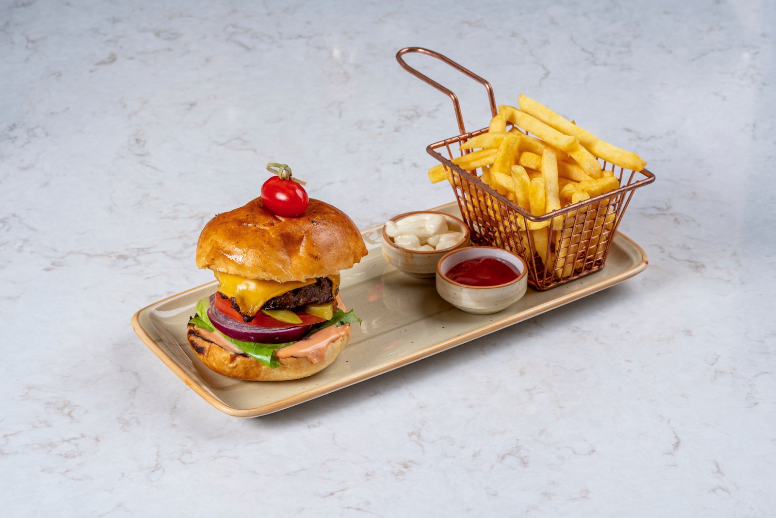 A Burger with 140-Gram Beef Patty, Onion, greens with french fries....