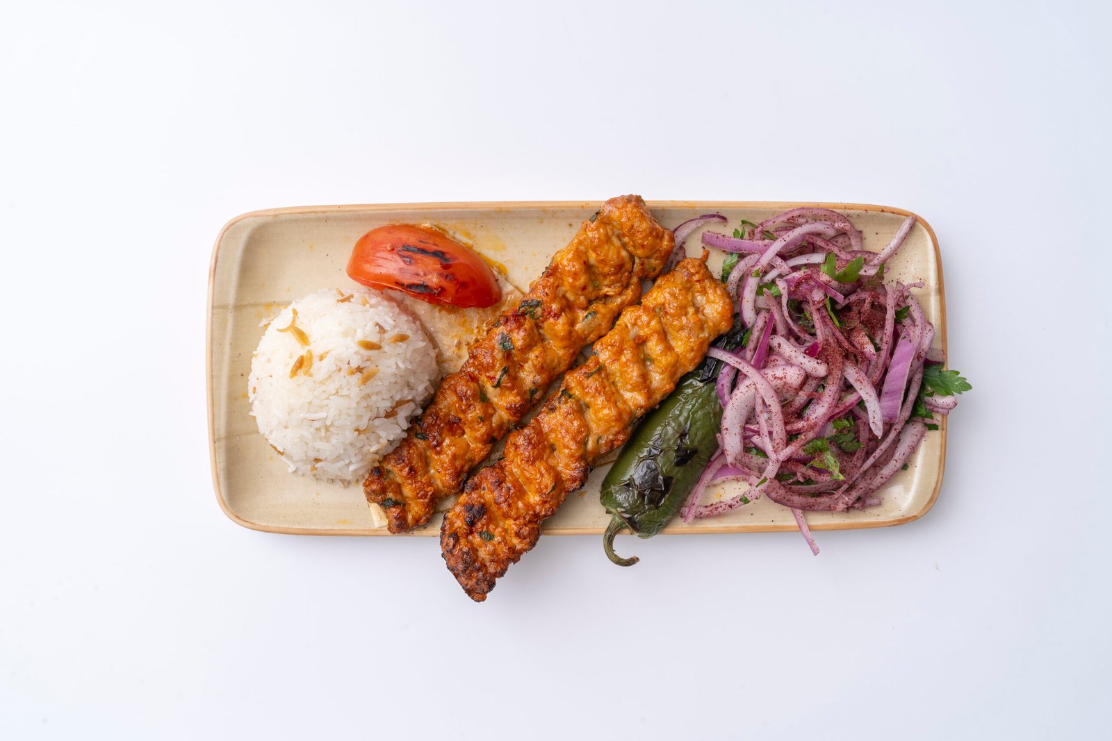 Grilled minced chicken kebab, hand-mixed with spices, and served with rice, grilled vegetables, and a mixed green salad.