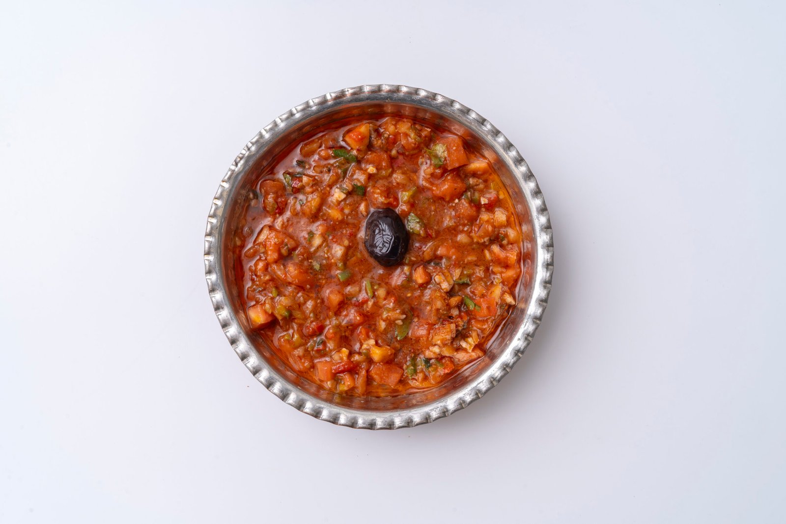 A spicy mix of finely chopped tomatoes, peppers, onions, and herbs, dressed with olive oil and pomegranate molasses.