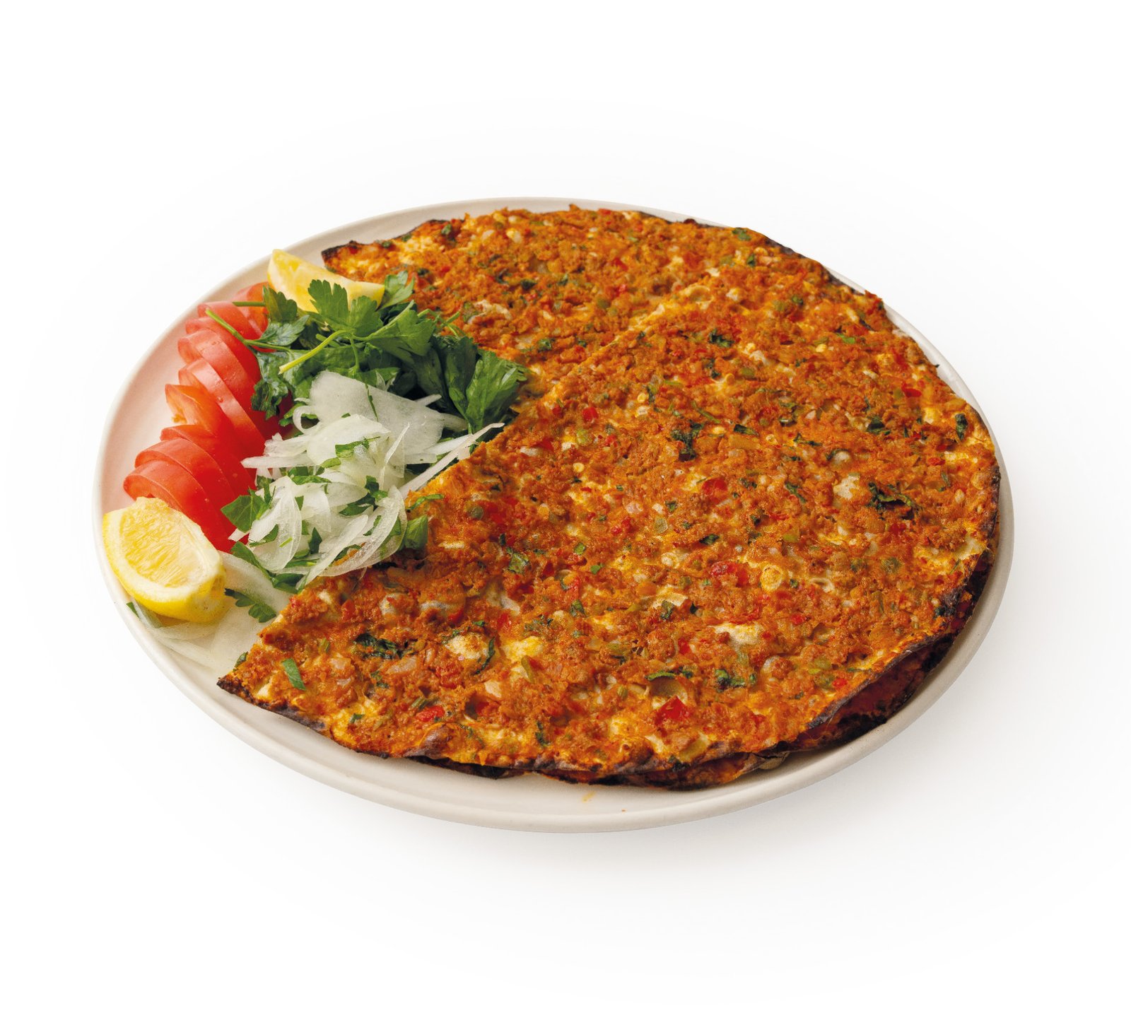 Thin and crispy Turkish-style flatbread, topped with a flavorful mixture of minced beef and lamb meat, tomatoes, peppers, onions, and herbs, baked to perfection. Served with fresh lemon, onion and parsley.